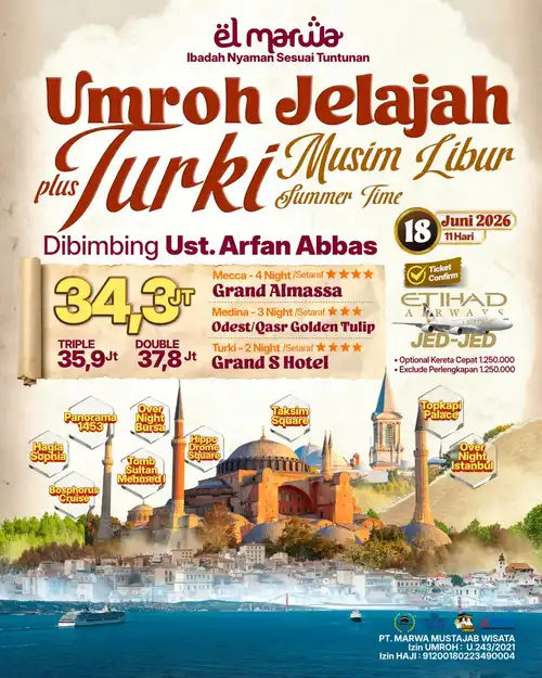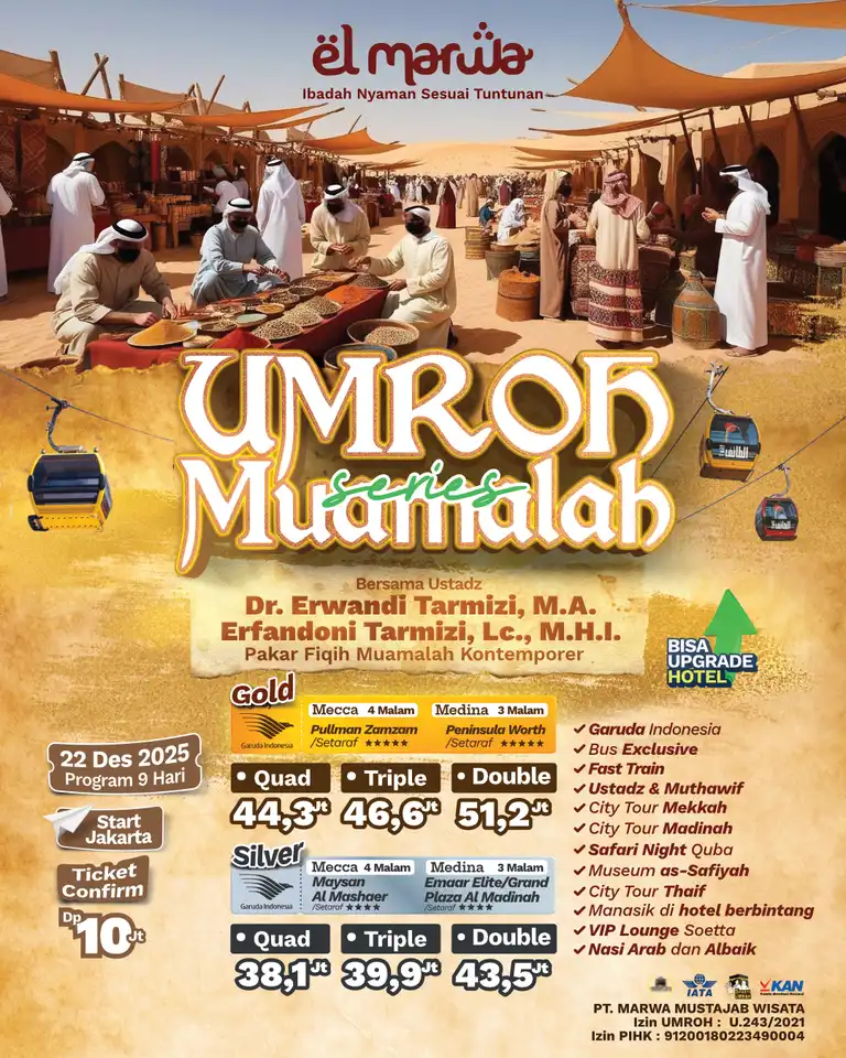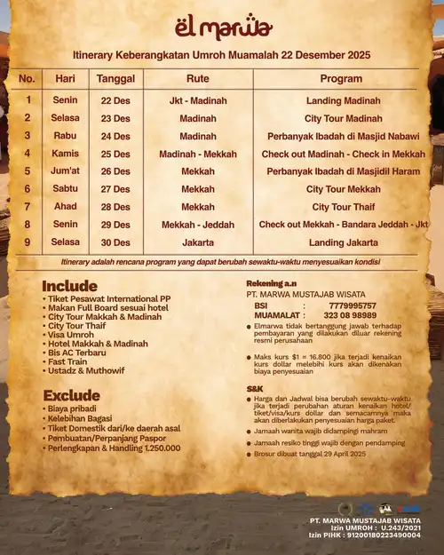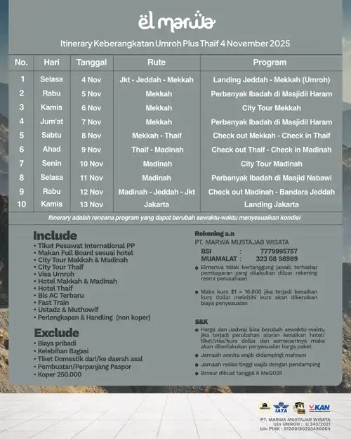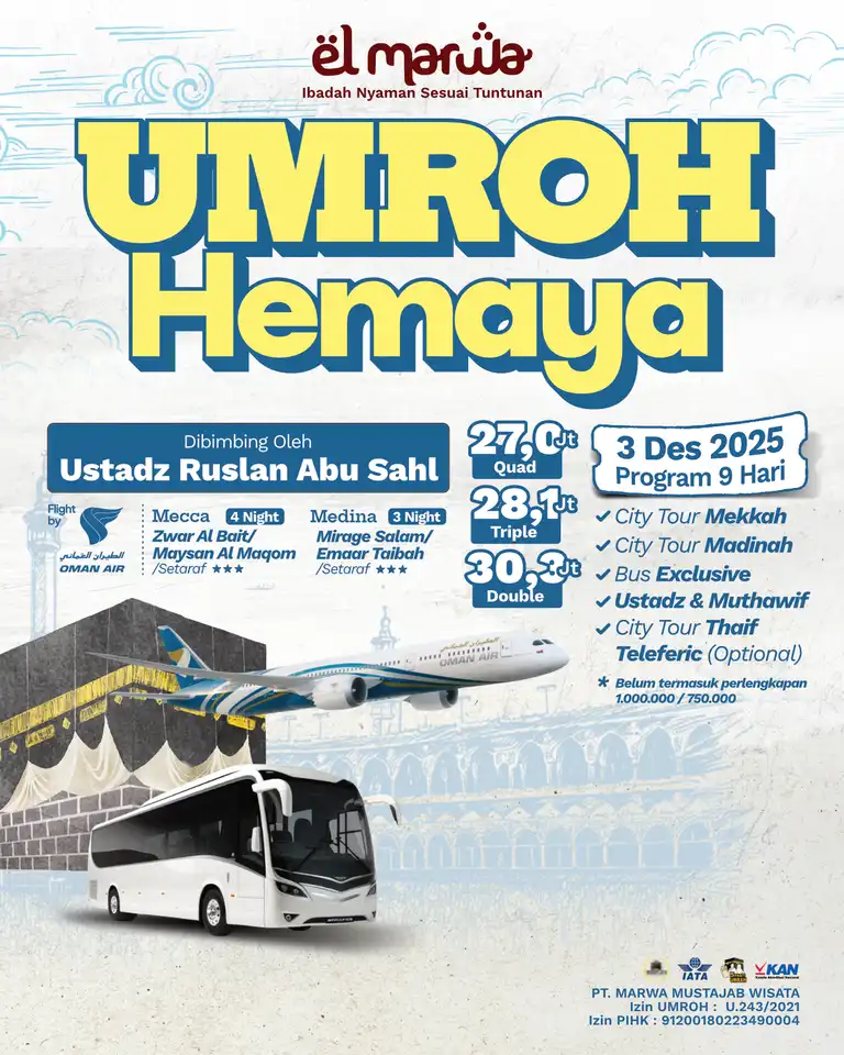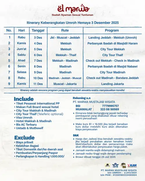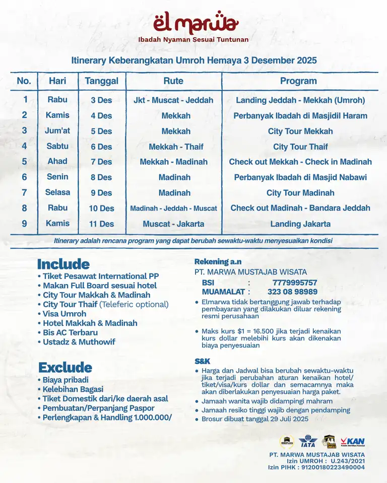 Selamat datang di Elmarwa Travel, partner yang dapat diandalkan untuk perjalanan umroh sesuai Sunnah . Dengan mengutamakan kenyamanan dan kepuasan jemaah melalui bimbingan ibadah yang berbasis Alquran dan As Sunnah , kami berkomitmen untuk menyediakan layanan berkualitas tinggi. Dengan profesionalisme, amanah, dan konsistensi, Anda dapat memenuhi kebutuhan perjalanan Anda, termasuk pemesanan tiket domestik dan internasional, pengurusan visa, dan berbagai jenis perjalanan lainnya. Kami siap mengantarkan Anda menuju pengalaman ibadah yang penuh makna dan keberkahan bersama pembimbing dan muthawif berpengalaman dan Bermanhaj Salaf.