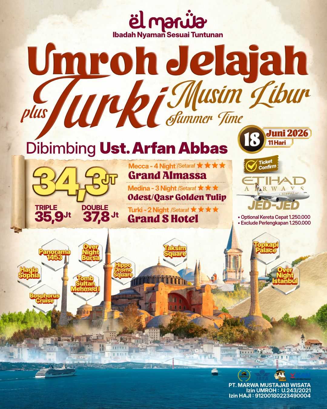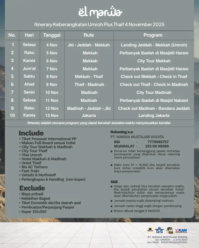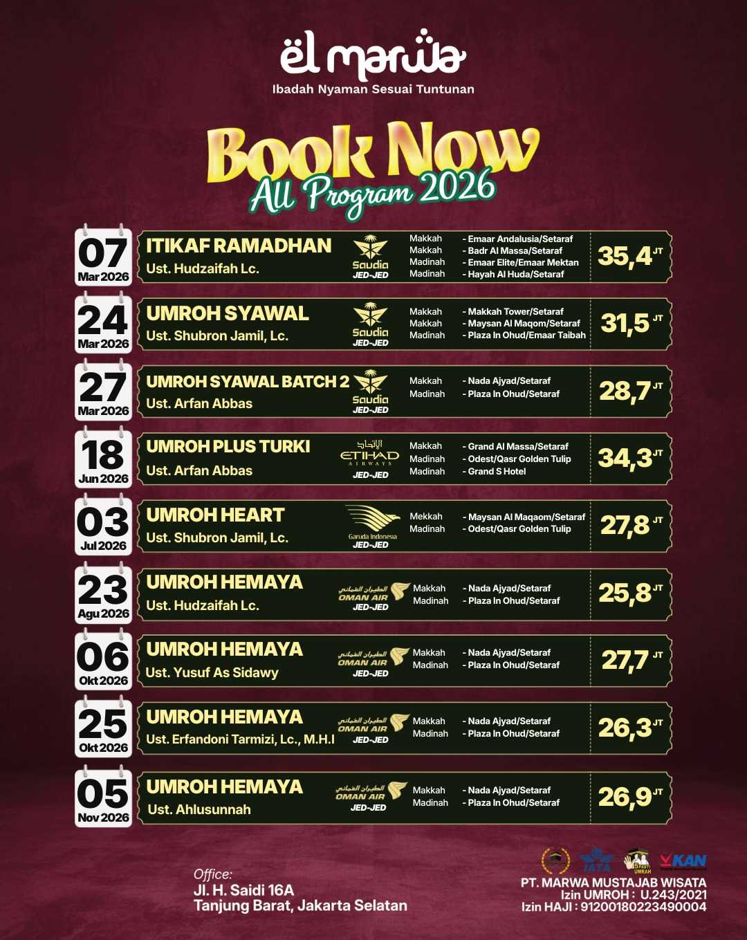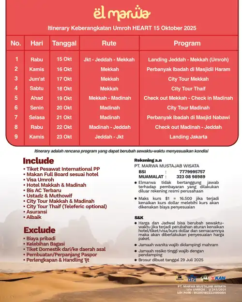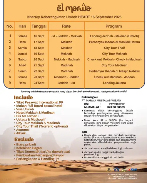 Selamat datang di Elmarwa Travel, partner yang dapat diandalkan untuk perjalanan umroh sesuai Sunnah . Dengan mengutamakan kenyamanan dan kepuasan jemaah melalui bimbingan ibadah yang berbasis Alquran dan As Sunnah , kami berkomitmen untuk menyediakan layanan berkualitas tinggi. Dengan profesionalisme, amanah, dan konsistensi, Anda dapat memenuhi kebutuhan perjalanan Anda, termasuk pemesanan tiket domestik dan internasional, pengurusan visa, dan berbagai jenis perjalanan lainnya. Kami siap mengantarkan Anda menuju pengalaman ibadah yang penuh makna dan keberkahan bersama pembimbing dan muthawif berpengalaman dan Bermanhaj Salaf.