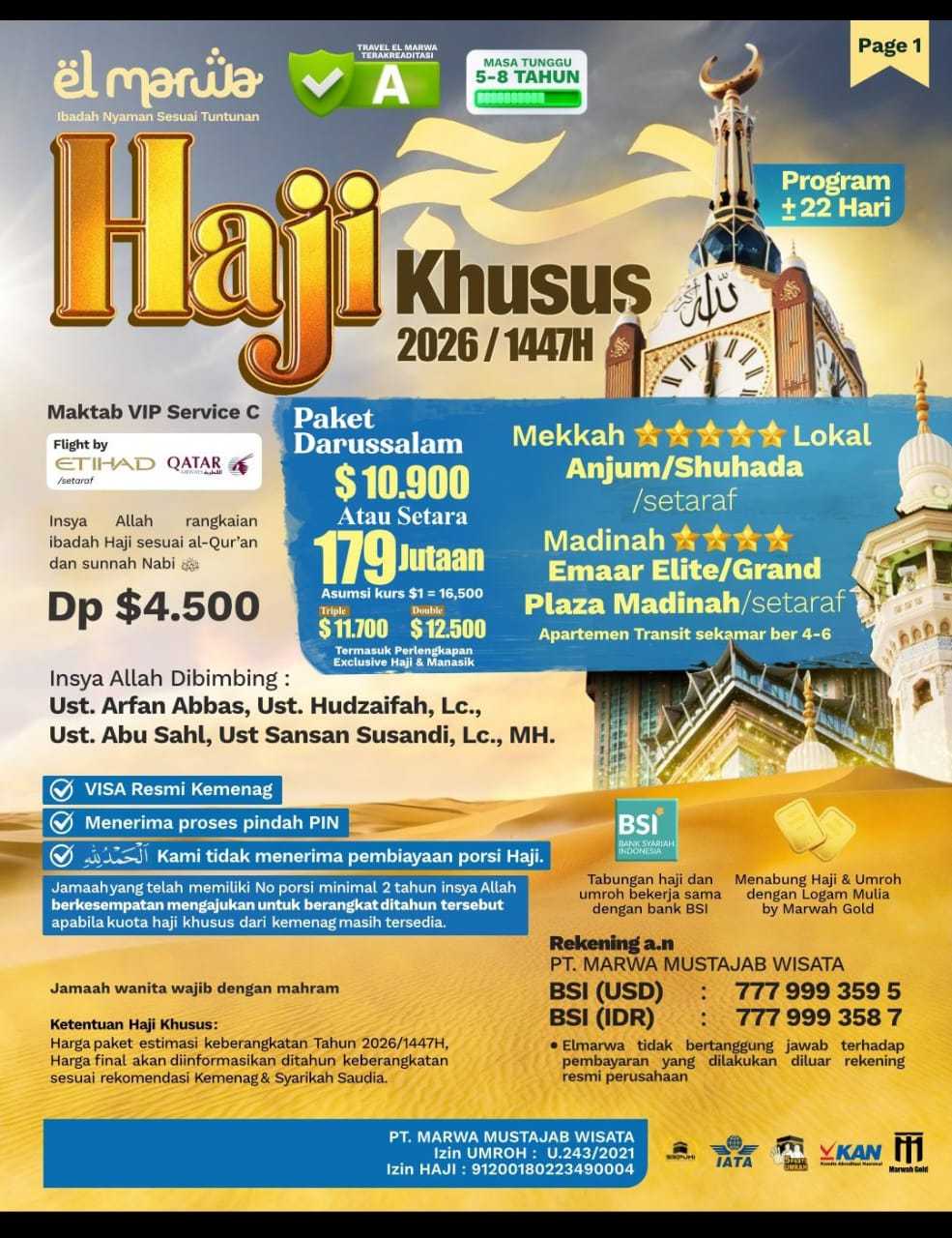 - Harga paket estimasi keberangkatan 2026/1447H, Harga final akan diinformasikan ditahun keberangkatan sesuai rekomendasi kemenag & Syarikah Saudia.