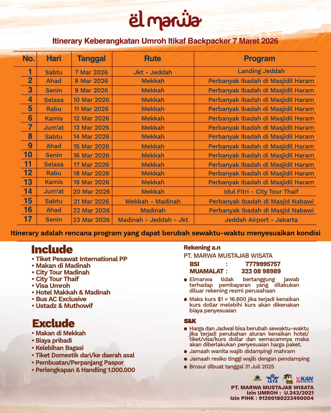 - Semua tata cara Ibadah di Elmarwa Travel Insya Allah sesuai dengan Al-Qur'an dan As-Sunnah
